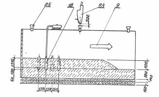 Рис. 4. Схема бетонирования конструкций на захватке Условные обозначения: 9 - общее направление производства работ; 13 - забетонированный участок перекрытия; 14 - участок уплотнения уложенной бетонной смеси; 15 - участок укладки бетонной смеси; 16 - участок подготовки основания; 17 - участок бетонирования порогов; 18 - глубинный вибратор; 19 - виброрейка; 20 - маячные рейки; 21 - инструментально-раздаточный пункт; 22 - универсальная распределительная сборка