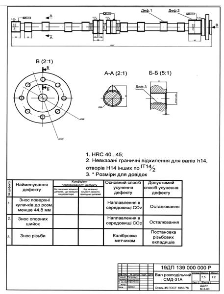 Після складання планів операцій, вибору режимів і розрахунку норм часу в курсовому проекті розроблюється ремонтне креслення деталі. На основі вибраного технологічного процесу відновлення, планів операцій, вибраних режимів відновлення, розрахунку норм часу і розробленого ремонтного креслення в курсовому проекті розроблюється комплект технологічної документації. Розробка технологічної документації. Технологічний процес – частина виробничого процесу, який містить в собі ціленаправлені дії зі змін і послідуючого визначення стану предмету праці (ГОСТ 3.1109-82). Проектуючи процес відновлення деталі студент повинен розробити відповідну технологічну документацію (МК, КЕ, ОК і КТТП). Маршрутна карта (МК) відновлення деталі складається на усі можливі дефекти згідно ЄСТД. Вихідними даними для розробки. МК служить карта ескізів або ремонтне креслення, схема обраного раціонального способу усунення дефектів, відомості для вибору обладнання і оснастки, розряд роботи і норми часу. Як ескіз до маршрутної карти відновлення деталі допускається подавати ремонтне креслення. При цьому на ньому повинні бути пронумеровані усі поверхні, які обробляються, вказані номера і назви дефектів. Номер поверхні, яка обробляється проставляють в колі діаметром 6...8 мм і з’єднують з розмірною лінією. Карта ескізів (КЕ) до маршрутної карти відновлення деталі є обов’язковим технологічним документом і складається за ГОСТ 3.1118-82. На КЕ повинні бути вказані дані, необхідні для виконання технологічних процесів відновлення (розміри, граничні відхилення, означення шорсткості поверхні, технічні вимоги тощо). Таблиці, схеми, технічні вимоги, а також номера і назви дефектів вказують праворуч від зображення або під ним. Ескізи виконуються від руки, без дотримування масштабу, в олівці чи туші. Необхідна кількість видів, розтинів, перерізів і виносних елементів на ескізі виробу встановлюється за умови забезпечення наочності і виразності зображення поверхні деталі, що відновлюється. Поверхні виробу, що відновлюються слід наводити суцільною лінією в 2...3 рази товщою від основної. На ескізах усі поверхні, що відновлюються нумерують арабськими цифрами в напрямку руху годинникової стрілки. Номер поверхні вказують в колі діаметром 6...8 мм і з’єднують з розмірною лінією. Ремонтне креслення деталі. До нормативно-технічної документації належать ремонтні креслення деталей (рис.3.1). Вони є робочим конструкторським документом для організації ремонтного виробництва, які містять значний обсяг даних технологічного характеру. Для розробки ремонтного креслення деталі необхідний певний комплект вихідних документів і даних, до яких відносяться: - робоче креслення на виготовлення деталі; - технічні вимоги на дефектацію деталі; - дані про коефіцієнти повторюваності дефектів (за результатами статистичної обробки даних про повторюваність дефектів, отриманих у процесі дефектації деталей даного найменування); - технічні вимоги на відновлювальну деталь; - технологічні способи усунення дефектів. Ремонтне креслення оформляють за правилами, встановленими ГОСТ 2.604-68 і РТМ 70.0001.053-85. Ремонтні креслення виконують на аркушах формату А3. При цьому зображення відновлюваної деталі, специфікацію, технічні вимоги і таблицю категорійних розмірів виконують на першому аркуші, а види, розміри, пе