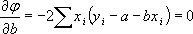 Рассмотрим теперь несколько более трудный случай, когда точки должны удовлетворить формуле y = a + bx (прямая, не проходящая через начало координат). Задача состоит в том, чтобы по имеющемуся набору значений xi, yi найти наилучшие значения a и b. Снова составим квадратичную форму φ, равную сумме квадратов отклонений точек xi, yi от прямой
