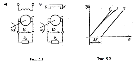 Электрические машины малой мощности, работающие в режиме генератора, выходное напряжение которых U г является практически линейной функцией частоты вращения вала n, называются тахогенераторами. Такие машины используются в автоматических системах управления и регулирования для измерения частоты вращения, для дифференцирования, для обратной связи по скорости и других операций. В качестве тахогенераторов применяются генераторы постоянного и переменного токов, в том числе синхронные и асинхронные генераторы. Обычно мощность таких машин менее 50 кВт. Основными требованиями, предъявляемыми к тахогенераторам, являются: линейность характеристики U г(n), большая её крутизна, определяемая как k = U г/ n, малая потребляемая мощность и минимальные погрешности. Тахогенераторы постоянного тока. Тахогенераторы постоянного тока (ТГПТ) представляют собой генераторы с независимым возбуждением (рис. 5.1, а) или с возбуждением от постоянных магнитов (рис. 5.1, б). ЭДС якоря определяется формулой Е=сЕ Ф n. При постоянном потоке Ф Е = k n. При холостом ходе Е=U г, т.е. U г= k n. Между U г и n линейная зависимость (прямая 1 на рис. 5.2). При нагрузке на магнитный поток Ф влияет реакция якоря и поэтому выходная характеристика несколько отличается от линейной (кривая 2 на рис. 5.2). Для сохранения линейности магнитная цепь машины должна быть ненасыщенной. Для ТГПТ допустимая погрешность составляет 0,5 – 3%. При нагрузке Кроме отмеченного недостатка, в ТГПТ имеет место пульсация выходного напряжения, которая вызвана работой коллектора: неточностью его изготовления, неравномерностью воздушного зазора, зубчатым строением якоря, неровностями коллектора и др. Преимущество ТГПТ заключается в том, что он удовлетворяет основным требованиям, предъявляемым к тахогенераторам.