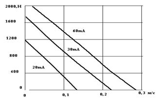 Чтобы получить экспериментальную точку механической характеристики необходимо замерить установившуюся скорость перемещения поршня dy/dt при заданной постоянной нагрузке (усилии сопротивления движению) F o и при заданном положении струйной трубки (или тока в обмотке управления ЭМП) I u. Замеры производятся при постоянном давлении питания привода р z. Замер скорости dy/dt, задание и замер тока управления I u в обмотках ЭМП производится аналогично, как описано в скоростной характеристике. Для создания постоянной нагрузки на штоке привода в схеме предусмотрен пневмодвигатель нагружатель (ПДН). Кинематическая схема соединения ПДН и привода ясна из рисунка. При постоянной установившейся скорости перемещения подвижной системы стенда, усилие развиваемое приводом равно усилию на поршне ПДН. Усилие на поршне ПДН (А пн) определяется давлением р в полости ПДН F o = р А пн Полость ПДН наполняется сжатым воздухом через кран Кр1. Стравливая воздух через кран Кр2, можно выставить заданное давление в полости ПДН. При перемещении поршня ПДН изменяется внутренний объем полости ПДН. Для обеспечения постоянства давления р с заданной точностью в схеме предусмотрена дополнительная емкость V б. Для объема состоящего из емкости баллона V б, и емкости полости ПДН 2 А пн y max можно записать для крайних положений поршня двигателя нагружателя на основании уравнения состояния для изотермического процесса F o (2 А пн y max + V б ) = p н2 V б. После несложных преобразований получаем p н2/ p н1 = 1 + (2 А пн y max)/ V б . Для постоянства усилия F o необходимо обеспечить постоянство давления p н . Из приведенного уравнения можно определить погрешность, вносимую правым слагаемым (2 А пн y max)/ V б → 0. Она должна быть минимальной. Для снятия характеристики в другом квадранте необходимо переключить полости ПДН.