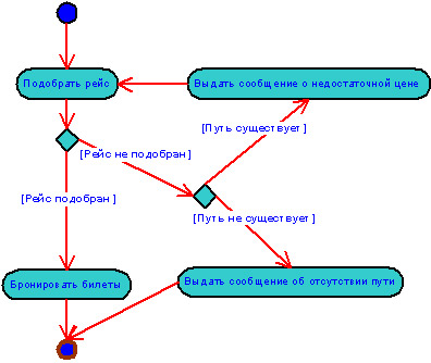На последнем пункте остановимся подробнее. Очевидно, название варианта использования не дает полного представления о том, как он претворяется в жизнь. Для описания сценария работы варианта использования UML содержит специальные средства. Основное из них - диаграмма действия. Диаграмма действия это блок-схема, которая отображает динамику в поведении системы. Заметим, что эта диаграмма может использоваться не только для описания сценариев Варианта использования. Приведем пример соответствующей диаграммы для варианта использования Бронирование билетов в системе SRS.