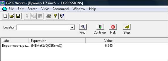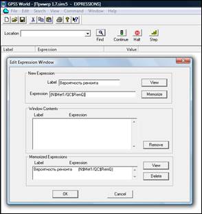 Откройте окно Window u Simulation Window u Expression Window (окно процесса моделирования). В строке Label введите комментарий Вероятность ремонта; в строке Expression (редактор выражений) (N$Met1/QC$RemQ) нажмите кнопки View и Memorize и ОК. Вы увидите вероятность ремонта СС (рис. 16).