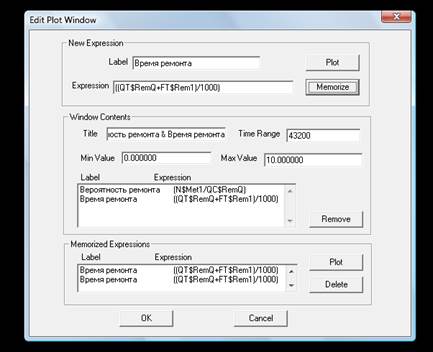 Вводим вторую переменную (для второго графика). В поле Label ставим метку (рис. 21): Время ремонта В поле Expression вводим переменную для построения второго графика: ((QT$RemQ+FT$Rem1)/1000) Это среднее время ремонта, определяемое как сумма среднего времени пребывания в очереди и среднего времени пребывания непосредственно в ремонте. Так как вероятность не может быть больше 1, а время ремонта может превысить 1000 мин, то для времени ремонта ввели масштабный множитель 1/1000, что бы рассмотреть оба графика на одном поле (в одном окне). Нажмите кнопки Plot и Memorize. Нажмите ОК.