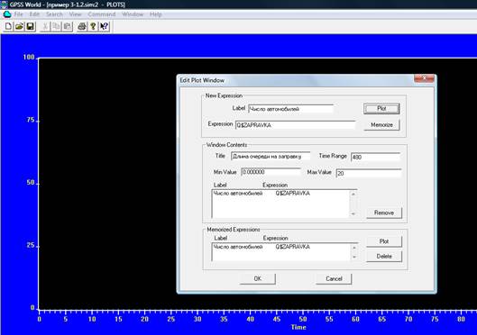 Дополнительно можно проанализировать работу системы с использованием графика и гистограммы. Для получения графика изменения какого-либо показателя работы системы (например, количество автомобилей в очереди на заправку во втором случаем модели) заполняются окна Plot Window (рис. 5).