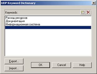 Рис. 10.1. Словарь ключевых слов UDP 2. Создайте UDP. Для этого перейдите в Dictionary/UDP и в словарь внесите имя UDP, например "Приложение". 3. Для UDP типа List необходимо в поле Value задать список значений. Для UDP - "Приложение". Внесите значение "Модуль оформления заказов" (рис. 10.2).