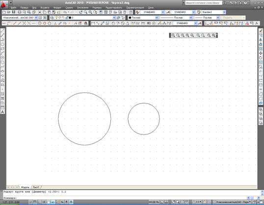 В двумерной (2М) системе координат точки задаются путем ввода двух значений, определяющих положение точки относительно горизонтальной (X) и вертикальной (Y) осей. Эти два значения должны отделяться друг от друга запятой, например, 0,0 2,3 2.25,6.05 1 В панели «Рисование» нажать кнопку «Круг» или выбрать в меню Рисование команду Круг – Центр, радиус.
