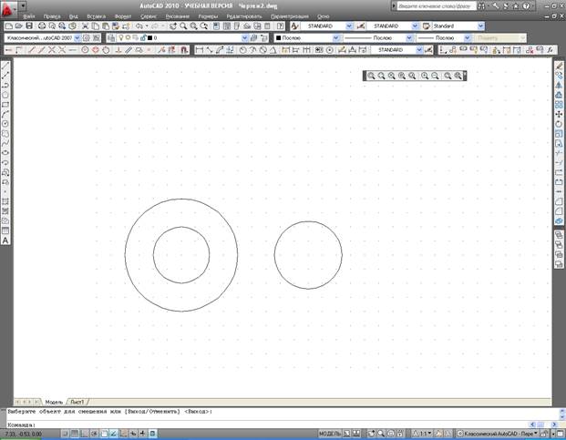 Вышеописанную операцию нужно повторить для правой втулки. 4 В панели «Редактирование» нажать кнопку «Смещение»(«Подобие»). Так как радиус правой втулки равен 1.2, введите значение смещения 0.6 Выберите правый круг, и укажите любую точку внутри правого круга в качестве стороны смещения После выполнения команды «подобие» полученный рисунок должен выглядеть Следующим образом:
