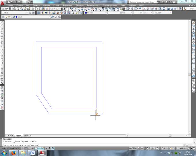 Рис. 1 Рис. 2 Построение дверного проема При рисовании дверного проема возникает проблема указания начала отрезка на заданном расстоянии от стены. 1. В панели «Рисование» нажать кнопку «Отрезок». AutoCAD запрашивает указать первую точку отрезка. Укажите точку как показано на рисунке