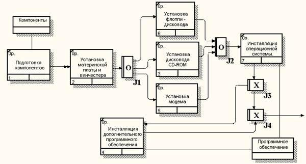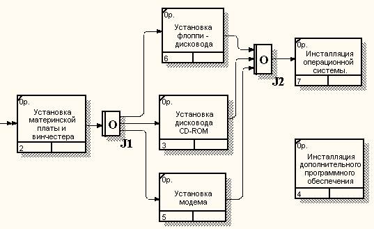 Рис. 7.3. Диаграмма IDEF3 после создания перекрестков 7. Правой кнопкой щелкните по перекрестку для разветвления (fan-out), выберите Name и внесите имя "Компоненты, требуемые в спецификации заказа". Создайте два перекрестка типа исключающего "ИЛИ" и свяжите работы, как показано на рис. 7.4.