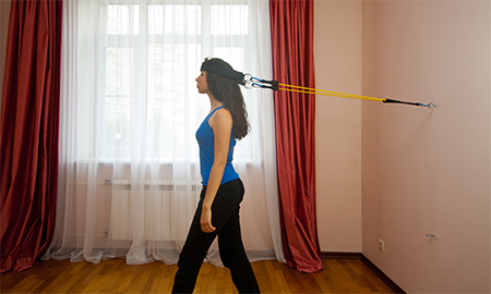 Задействованные мышцы:Мышцы задней части шеи. Исходное положение: Закрепите эспандер с помощью фиксатора к стене в верхнем положении и пристегните концы эластичной трубки к кольцам лямки. Встаньте лицом к стене и расположите лямку на затылочной области головы. Отодвиньтесь от стены на расстояние легкого натяжения эластичных трубок. Шея и спина полностью прямые. Выполнение упражнения: На выдохе плавно сделайте шаг назад, сохраняя вертикальное положение шеи. Сделайте паузу 2-3 секунды. На вдохе плавно вернитесь в исходное положение. Рекомендуемая начальная нагрузка: мужчины - зеленая или желтая трубка, женщины - желтая трубка.