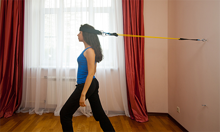 Задействованные мышцы: Мышцы передней части шеи. Исходное положение: Закрепите эспандер с помощью фиксатора к стене в положении на уровне груди и пристегните концы эластичной трубки к кольцам лямки.Встаньте спиной к стене и расположите лямку на лбу. Отодвиньтесь от стены на расстояние легкого натяжения эластичных трубок. Одна нога выставлена вперед. Шея и спина полностью прямые. Выполнение упражнения: На выдохе плавно согните ногу в колене и подайте туловище вперед, сохраняя вертикальное положение шеи. Сделайте паузу 2-3 секунды. На вдохе плавно вернитесь в исходное положение.