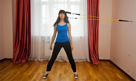 Задействованные мышцы: грудино-ключично-сосцевидная мышца, другие мышцы шеи. Исходное положение: Закрепите эспандер с помощью фиксатора к стене в положении на уровне груди и пристегните концы эластичной трубки к кольцам лямки. Встаньте боком к стене и расположите лямку над ухом. Отодвиньтесь от стены на расстояние легкого натяжения эластичных трубок. Ноги вместе. Шея и спина полностью прямые. Выполнение упражнения: На выдохе плавно сделайте шаг в сторону, сохраняя вертикальное положение шеи. Сделайте паузу 2-3 секунды. На вдохе плавно вернитесь в исходное положение Рекомендуемая начальная нагрузка: мужчины - зеленая или желтая трубка, женщины - желтая трубка.