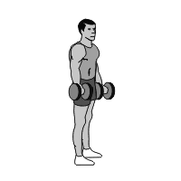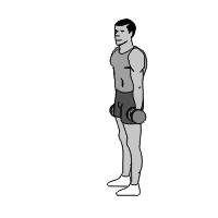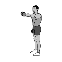 Встаньте прямо, ноги на ширине плечь. Гантели держите по обе стороны тела так, чтобы ладони смотрели назад. Ноги слегка согнуты в коленях. Делая вдох, поднимайте гантелю вверх правой рукой. Как плечо станет параллельным полу опустите руку вниз, делая выдох. То же самое проделайте левой рукой. Повторите упражнение несколько раз.