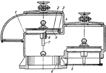 Рис.2.6. Непромерзающий механический дыхательный клапан: 1- корпус; 2- тарелка; 3- седло; 4- обойма; 5- защитный кожух; 6- огнепреградитель; 7- шток; 8- направляющая труба; 9- покрытие тарелки (пленка из фторопласта 4).