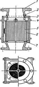 Огнепреградители, или заградители пламени (рис. 2.7.), предохраняют резервуар от проникновения внутрь его огня и искр через дыхательные и предохранительные клапаны. Огнепреградители представляют собой фольговую кассету, состоящую из гофрированных и плоских алюминиевых лент, свитых в спираль и образующих ряд параллельных клапанов. Огневые преградители обычно монтируются под дыхательным клапаном. Принцип действия огневого предохранителя основан на том, что пламя или искра не способны проникнуть внутрь резервуара через отверстие малого сечения в условиях интенсивного теплоотвода.