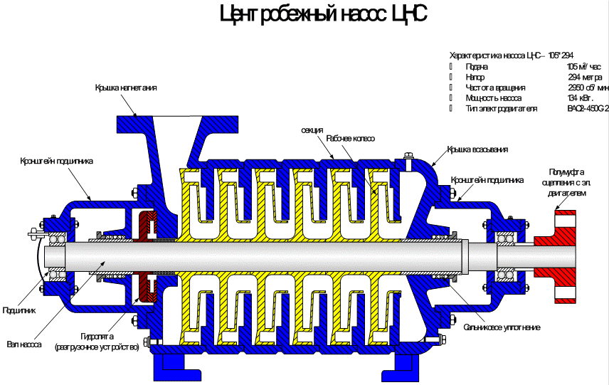 Характеристика насоса ЦНС – 105*294: - Подача 105 м3/час - Напор 294 метра - Частота вращения 2950 об/мин. - Мощность насоса 134 кВт. - Тип электродвигателя ВАО2-450С-2