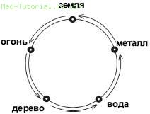 Рис. 4. Взаимодействие органов по циклу у‑син Древневосточные врачи применяли концепцию у‑син к анализу жизнедеятельности организма человека и для упорядочения сущности многообразных отношений человека и природы; сходства между этими отношениями и пятью первоэлементами устанавливались исключительно на основании аналогий. Эти аналогии были обобщены и впервые представлены в виде таблиц в трактате «Хуанди нэй‑цзин». В представлении древневосточных мыслителей дерево имело следующие свойства: возникновение путем роста в теплый период, зеленый цвет и т. д., поэтому все вещи (явления), обладающие такими свойствами, относились к первоэлементу дерево. Огонь имеет свойства жары и поднимающегося вверх пламени, поэтому этот элемент в медицине обозначает локализацию жара, или воспаление, в верхней части тела, а все вещи (явления), обладающие свойствами огня, отнесены к первоэлементу огонь. Для земли свойственны плодородие, питание и превращения, поэтому под первоэлементом земля об» единены сходные явления. Свойства металлов – пустота, чистота, хрупкость, стройность и легкость; поэтому вещи (явления), сходные по свойствам с металлом, отнесены к первоэлементу металл. Вода обдадает текучестью, прохладой (холод), способностью к движению назад, поэтому явления, обладающие такими свойствами, под символом первоэлемент вода. Закон взаимодействия пяти элементов проявляется следующим образом: созидание, противосозидание, угнетение, противоугнетение. В представлении древних медиков закон созидания выглядит следующим образом: дерево стимулирует (рождает) огонь, огонь стимулирует (рождает) землю, земля стимулирует (рождает) металл, металл стимулирует (рождает) воду, вода стимулирует (питает) дерево). Созидающая связь оказывает стимулирующее действие; в ней каждый последующий элемент усиливается предыдущим элементом (рис. 5, 6).