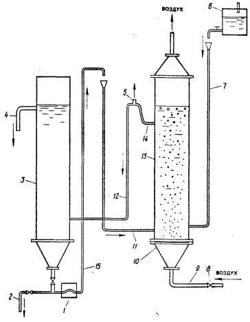 Опытная устаноѳка (рис. 5.1) содержит технологические модели соответственно аэротенка-смесителя в виде вертикальной колонны 13 диаметром 100 см и высотой 2 м и вторичного вертикального отстойника в виде вертикальной колонны 3 диаметром 100 см и высотой 2 м с конусообразным днищем. B нижней части колонны 13 имеется пневматический мелкопузырчатый аэратор 10 в виде воронки, обтянутой фильтровальной тканью из синтетических волокон. B нижней части колонны 3 имеется штуцер 2 для периодического отведения избыточного АИ, а в верхней части — штуцер 4 для отведения осветленной СЖ. Очищенная СЖ из подающего бачка 6 поступает по шлангу 7 в нижнюю часть АУПО 13. Иловая смесь поступает во вторичный отстойник 3 по шлангам 12 и 14 через тройник — воздухоотделитель 5. Рециркулирующий АИ непрерывно перекачивается из конической части вторичного отстойника 3 в нижнюю часть АУПО при помощи перистальтического насоса 1 регулируемой производительности и шлангов 11 и 15. Степень рециркуляции Ri активного ила, равная отношению q,/qCm,обычно составляет 0,5—3,5. Регулирование подачи воздуха, поступающего в аэрационное устройство АУПО по шлангу 9, производится при помощи винтового зажима 8.