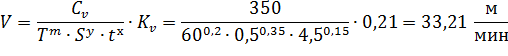 Коэффициент на инструментальный материал: Kиv=1; Коэффициент глубины сверления: Klv=1; Общий поправочный коэффициент: Kv= Kmv•Kиv•Kпv =0,33; По таблице 28 стр. 278 [3] находим: Сv=9,8; q=0,4; y=0,5; m=0,2; Стойкость Т=90. Определяем скорость резания: