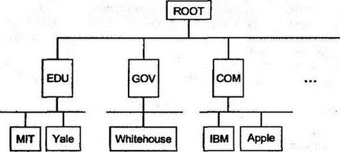 Имена Интернета структурированы как дерево (см. рис. 5.1). Каждому узлу дерева присвоена метка. Каждый узел дерева имеет имя, называемое именем домена (domain name). Имя домена для узла создается из меток, проходимых по пути от этого узла до вершины дерева. Имена доменов узлов записываются как последовательность меток, разделенных точками.