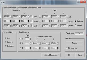 1 Выделим Okno Bool и Okno Decor. 2 Создадим двумерный массив форм с помощью инструмента Array. (Menu> Tools> Array). В диалоговом окне Array, в разделе Incremental, щёлкнем по стрелке, расположенной перед меткой с названием Move.Поставим Х=430. В левом нижнем углу этого диалогового окна, в разделе Type of Object отметим пункт Copy.В разделе Dimensions поставим переключатель в положение 1D и поставим 4 в счётчик Count.В разделе Array Dimensions поставим переключатель в положение 2D и поставим 2 в счётчик Count. В разделе Array Dimensions поставим в счётчик Z=630. Нажмём ОК.