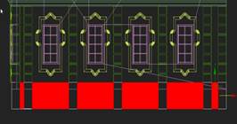 Перейдём на вкладку [ Modify] командной панели. Выберем подобъект Edge(ребро) В окне проекции на передней стороне объекта Border Bottom выделим верхние и нижние рёбра. В свитке Edit Edges щёлкнем по иконке напротив кнопки Connect.В диалоговом окне Connect Edges ставим в счётчикSegments 12, счётчик Pinch ставим 0. Нажимаем ОК. Перейдём в окно проекции Front. На панели Трансформация щёлкнем ПКМ по кнопке Select and Move и с помощью Гизмо Move переместите строго по горизонтали полученных 12 ребёр так, чтобы они совпали с боковыми краями нижних колонн, по два ребра на каждую колонну. Щёлкнем ПКМ в окне проекции, в квадменю выбираем Polygon. В окне проекции выделим 6 полигонов, как показано на рисунке.
