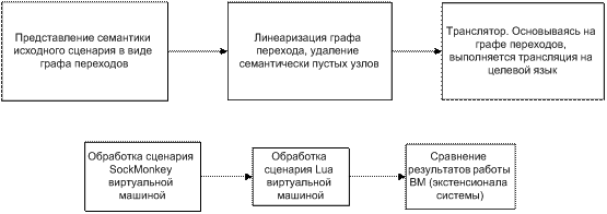 Облако – это взаимодействие программных компонентов для поддержания концепции виртуализации. Информационное пространство при этом представляет собой гетерогенную среду, имеющую различные протоколы и программное обеспечение. В таком случае с практической точки зрения имеет смысл обеспечить лёгкий перенос между различными облачными решениями. В работе предлагается использовать автоматическую трансляцию для автоматизации процесса программирования, таким образом, осуществив расширение информационного пространства, сократив затраты на ресурсы при создания платформы для облака. В ходе исследования задач трансляции была совершена попытка найти решение проблем, связанных с быстрым ростом и изменением языков программирования, упростить изучение и обновление программ, переход на более высокий уровень абстракции. Разработан комплекс программ. Он включает в себя автоматический транслятор, исходным для которого является неструктурный язык, а целевым – структурный язык Lua, виртуальная машина, общая для сценариев, реализованных различных языках, а также вспомогательные программы для построения визуального представления семантики сценариев в виде графа переходов и его линеаризации. Языки для исследования были выбраны таким образом, чтобы в них сочетались все крайние характерные свойства для парадигм, однако это не единственное возможное решение[6]. Этапы процесса трансляции и процесса эмпирического доказательства правомерности полученных результатов представлены на рис. 7.