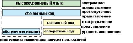 Используя модель виртуальной машины, обеспечивающей независимость исполнения программ от платформы (рис.11), создаём виртуальную машину для двух языков – исходного и целевого. В обычной среде объектный код (независящий от аппаратного обеспечения) компилируется в бинарный машинный код для исполнения на аппаратной платформе. В виртуальной среде объектный код сразу интерпретируется абстрактной машиной с целью исполнения.