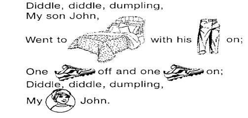Ще одним прикладом творчого використання фонетичного матеріалу може бути спосіб опрацювання такої заримівки: Diddle, diddle, dumpling, Му son John, Went to bed with his Trousers on; One shoe off, and one shoe on, Diddle, diddle, dumpling, My son John! □ Підготовка до роботи з римівкою