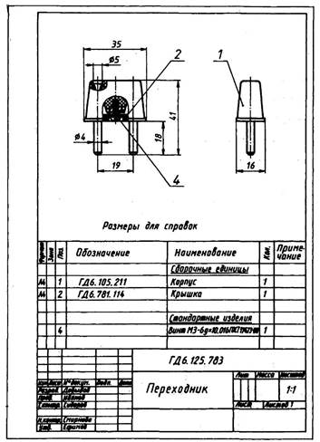 Рассмотрим сборочный чертеж изделия «Переходник» (рис. 212). На нем сборочная единица представлена двумя изображениями: видом спереди, содержащим местные разрезы, и видом слева. В состав сборочной единицы входят две другие сборочные единицы: корпус / и крышка 2, которые соединяются между собой винтом неподвижно. Эти сборочные единицы выполнены из различных материалов: крышка и корпус — из пластмассы, а втулка, запрессованная в корпус, и контакты — из металла. На сборочном чертеже даны габаритные (41, 35, 16), присоединительные (? 4,? 5) и установочные (19, 18) размеры. В технических требованиях уточняется, что все размеры, нанесенные на данном сборочном чертеже, — справочные. Одни из них перенесены с чертежей деталей и используются как присоединительные (19) и установочные (? 4,? 5) а другие являются суммой размеров нескольких деталей (41).