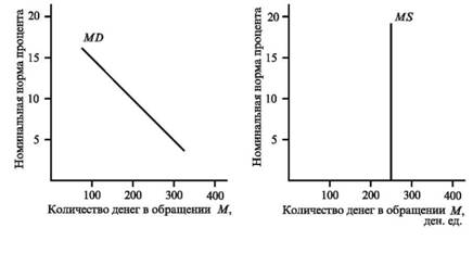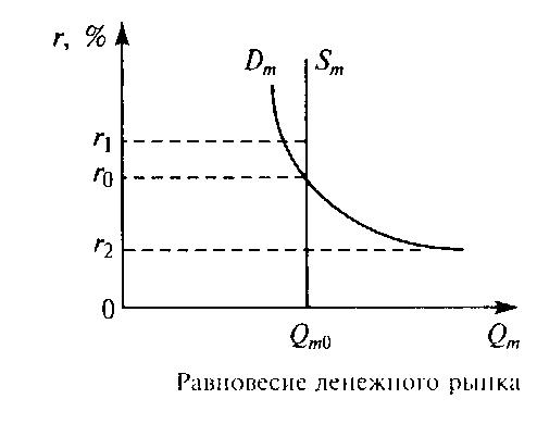 На макроэкономическом уровне предложение денег имеет своей природной границей общую массу денег в обращении (по агрегату М1) и не может превышать его, как бы ни изменялась доходность финансовых активов. Поэтому предложение денег в определенных условиях можно считать постоянным фактором, не зависящим от динамики процентной ставки. При увеличении или уменьшении массы денег в обращении кривая МS сместится вправо или влево, оставшись в вертикальном положении, что подтверждает независимость общей массы предложения денег от процентной ставки. 16. Оптимальным состоянием для денежного рынка является равновесие между спросом на деньги и их предложением. Равновесие на денежном рынке устанавливается при равенстве спроса на деньги и их предложения, когда количество предлагаемых денежных средств равно количеству денег, которое хотят иметь домохозяйства и фирмы. Графически равновесие на денежном рынке достигается при пересечении кривых спроса на деньги Dm и их предложения Sm. Предположим, что правительство и центральный банк страны проводят политику неизменной денежной массы. График предложения денег Sm будет иметь вид вертикальной прямой.