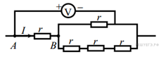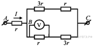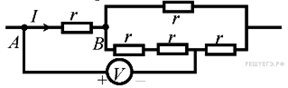 23. A 12 № 5610. Пять одинаковых резисторов с сопротивлением r = 1 Ом соединены в электрическую цепь, схема которой представлена на рисунке. По участку AB идёт ток I = 4 А. Какое напряжение показывает идеальный вольтметр?