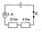 Ученик собрал электрическую цепь, изображенную на рисунке. Какая энергия выделится во внешней части цепи при протекании тока в течение 10 мин? Необходимые данные указаны на схеме. Амперметр считать идеальным.