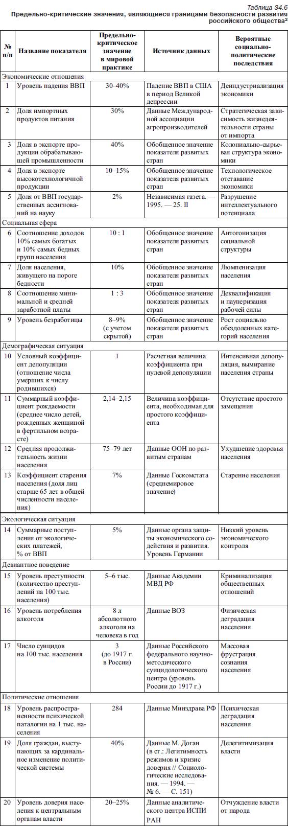 Стоит сказать - положительным будет то, что авторы попытались количественно оценить не только экономическую, но и социальную сферу, демографическую и экономическую ситуацию, девиантное поведение, политические отношения. При всем этом они необоснованно сузили число показателей по ключевой сфере – экономической безопасности. Материал опубликован на http://зачётка.рф В табл. 34.6 не приведен такой распространенный показатель, как производство ВВП на душу населения.