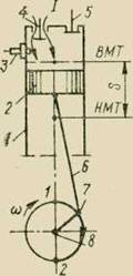 Реальные и идеальные циклы Виды поршневых ДВС Рабочим телом в ДВС являются в начале воздух или смесь воздуха с топливом, а в конце – смесь газов, образовавшаяся при сгорании топлива. Теплота к рабочему телу подводится от сжигаемого топлива внутри цилиндров двигателя, в которых расширяющийся от нагревания газ перемещает поршень. Полученная газом энергия частично расходуется на совершение механической работы, остальная часть отдается окружающей среде. Основными элементами любого поршневого ДВС являются цилиндр 1 с поршнем 2, возвратно-поступательное движение которого преобразуется во вращательное движение коленчатого вала 8 с помощью кривошипно-шатунного механизма 6, 7 (рис. 1). В верхней части цилиндра размещены впускной 4 и выпускной 5 клапаны, приводимые в движение от главного вала двигателя, а также свеча зажигания 3 топливной смеси (или форсунка дляраспыления топлива). Помимо этого у ДВС имеются механизм газораспределения, системы питания топливом, зажигания, смазки, охлаждения и регулирования (на рисунке не показаны).