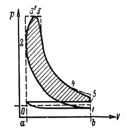 Рассмотрим диаграмму: 0-1 – заполнение цилиндра воздухом (при внутреннем смесеобразова-нии) или рабочей смесью (при внешнем смесеобразовании) при давлении несколько ниже атмосферного из-за гидродинамического сопротивления впускных клапанов и всасывающего трубопровода, 1-2 – сжатие воздуха или рабочей смеси, 2-3'-3 – период горения рабочей смеси, 3-4 – рабочий ход поршня (расширение продуктов сгорания), совершается механическая работа, 4-5 – выхлоп отработавших газов, падение давления до атмосферного происходит практически при постоянном объеме, 5-0 – освобождение цилиндра от продуктов сгорания. В реальных тепловых двигателях преобразование теплоты в работу связано с протеканием сложных необратимых процессов (имеются трение, химические реакции в рабочем теле, конечные скорости поршня, теплообмен и др.) Термодинамический анализ такого цикла невозможен. В связи с этим для выявления основных факторов, влияющих на эффективность работы установок, действительные процессы заменяютобратимыми термодинамическими процессами, допускающими применение для их анализа термодинамических методов. Такие циклы называют теоретическими. Допущения, используемые для теоретических циклов: 1) циклы замкнуты (в действительности продукты сгорания удаляются в атмосферу, а на их место поступает новое рабочее тело). 2) Рабочее тело – идеальный газ с постоянной теплоемкостью 3) Подвод теплоты осуществляется от внешних источников теплоты, а не за счет сжигания топлива (аналогично отвод теплоты) 4) Механические потери (трение, потери теплоты) отсутствуют. 5) Процессы 0-1 и 5-0 исключают из рассмотрения, т.к. работа в них практически одинаковая, только имеет разный знак.