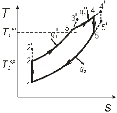 2) С увеличением степени повышения давления конечная точка процесса 2-3 сместится в т.3'. Средняя температура подвода теплоты Обычное значение