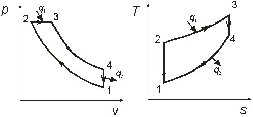 Рис.7. Цикл Дизеля. Рабочая (p - v) и тепловая (T - s) диаграммы. (1-2 – адиабатное сжатие, 2-3 – изобарный подвод теплоты, 3-4 – адиабатное расширение, 4-1 – изохорный отвод теплоты)