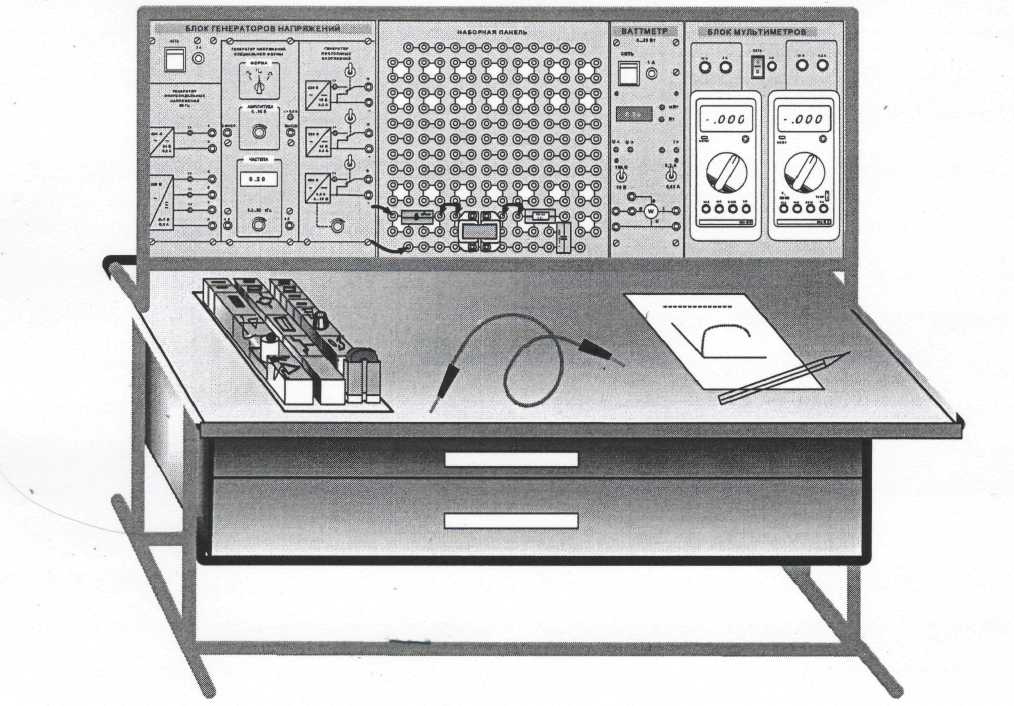 Все лабораторные работы, представленные в данных методических указаниях, выполняются на универсальном лабораторном стенде. Основными компонентами лабораторного стенда являются: · блок генераторов напряжений; · наборная панель; · набор миниблоков; · набор трансформаторов; · блок мультиметров; · ваттметр; · соединительные провода и перемычки, питающие кабели. Для осуществления в полном объёме всех экспериментов, описанных в данном руководстве, необходим двухканальный осциллограф, имеющий режим работы «X-Y». Общая компоновка лабораторного стенда показана на рис. 1. На лабораторном столе закреплена рама, в которой устанавливаются отдельные блоки. Расположение блоков может изменяться для проведения того или иного конкретного эксперимента. Наборная панель, на которой собирается электрическая цепь из миниблоков может устанавливаться и непосредственно на столе.