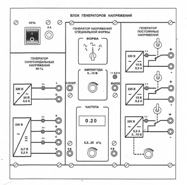 В выдвижных ящиках хранятся наборы миниблоков и устройств, соединительные провода, перемычки и кабели, методические материалы. Один из наборов миниблоков показан на рис. 1 на столе. Ящики имеют встроенные замки. Лицевая панель блока генераторов напряжений показана на рис. 2. Блок состоит из генератора синусоидальных напряжений, генератора напряжений специальной формы и генератора постоянных напряжений. Все генераторы включаются и выключаются общим выключателем «СЕТЬ» и защищены от внутренних коротких замыканий плавким предохранителем с номинальным током 2 А.
