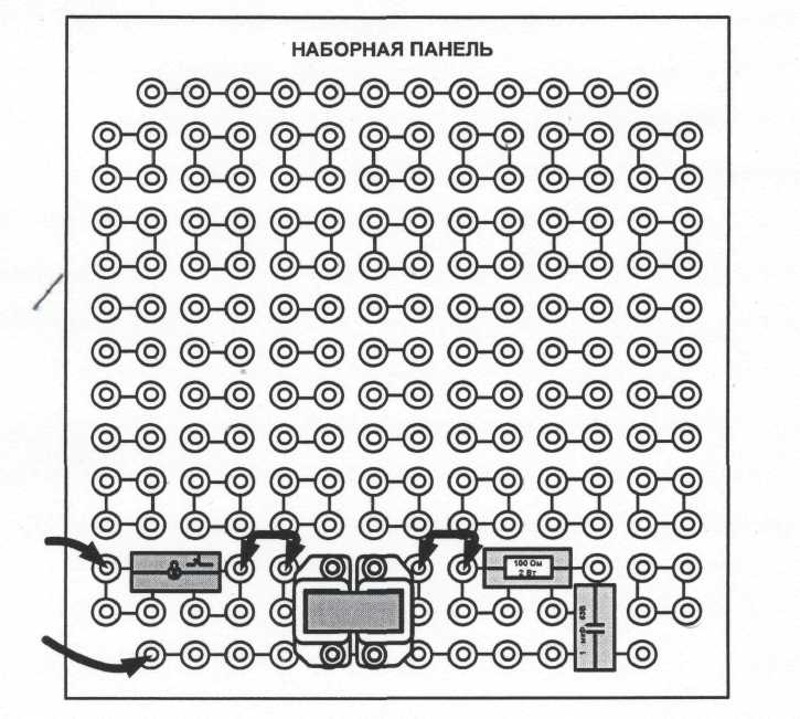 На лицевой панели блока указаны номинальные напряжение и ток каждого источника напряжения, а также диапазоны изменения регулируемых выходных величин. Все источники напряжений гальванически изолированы друг от друга и от корпуса блока и защищены от перегрузок и внешних коротких замыканий самовосстанавливающимися предохранителями с номинальным током 0,2 А. О срабатывании предохранителя свидетельствует индикатор «I>». Генератор синусоидальных напряжений содержит однофазный источник напряжения 24 В (вторичная обмотка питающего трансформатора 220/24 В) и трёхфазный стабилизированный по амплитуде выходного напряжения преобразователь однофазного напряжения в трёхфазное. Выходное сопротивление трёхфазного источника в рабочем диапазоне токов близко к нулю. Генератор напряжений специальной формы вырабатывает на выходе синусоидальный, прямоугольный двухполярный или прямоугольный однополярный сигнал в зависимости от положения переключателя «ФОРМА». Выходное сопротивление генератора в рабочем диапазоне токов также близко к нулю. Между гнездами «СИНХР» и «0 В» генератора при любом положении переключателя «ФОРМА» вырабатываются однополярные прямоугольные импульсы амплитудой 5 В, которые можно использовать для внешней синхронизации осциллографа. Частота сигнала регулируется десятиоборотным потенциометром «ЧАСТОТА» и не зависит как от формы и амплитуды сигнала, так и от тока нагрузки. Генератор постоянных напряжений содержит три источника стабилизированного напряжения 15 В, гальванически изолированных друг от друга. Выходное напряжение одного из этих источников регулируется от 0 до 15 В десятиоборотным потенциометром. Выходные сопротивления этих источников также близки к нулю и все они допускают режим работы с обратным током (режим потребления энергии). Для получения постоянных напряжений больше 15В они могут соединяться последовательно. Для исключения источников из собранной схемы цепи используются переключатели (тумблеры). Наборная панель (рис. 3) служит для расположения на ней миниблоков в соответствии со схемой данного опыта.