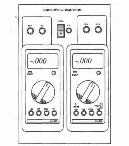 Гнёзда на этой панели соединены в узлы, как показано на ней линями. Поэтому часть соединений выполняется автоматически при установке миниблоков в гнёзда панели. Остальные соединения выполняются соединительными проводами и перемычками. Так, на фрагменте цепи, показанной на рис. 3, напряжение подаётся проводами через выключатель к одной из обмоток трансформатора. К другой обмотке подключены резистор и конденсатор, соединённые последовательно. Для измерения токов в ветвях цепи удаляется одна из перемычек и вместо неё в образовавшийся разрыв включается амперметр. Для измерения напряжений на элементах цепи параллельно рассматриваемому элементу включается вольтметр. Миниблоки представляют собой отдельные элементы электрических цепей (резисторы, конденсаторы, индуктивности диоды, транзисторы и т.п.), помещённые в прозрачные корпуса, имеющие штыри для соединения с гнёздами наборной панели. Некоторые миниблоки содержат несколько элементов, соединённых между собой или более сложные функциональные блоки. На этикетках миниблоков изображены условные обозначения элементов или упрощённые электрические схемы их соединения, показано расположение выводов и приведены основные технические характеристики. Миниблоки хранятся в специальном контейнере. Большинство миниблоков содержат по одному элементу электрических цепей. Состав этого набора приведён в табл. П.3 Приложения. Набор трансформаторов включает в себя четыре разборных трансформатора, выполненных на разъёмных U-образных сердечниках из электротехнической стали с толщиной листа 0,08 мм. Сечение сердечника 16x12 мм. На трёх трансформаторах установлены катушки 900/300 витков, на четвёртом 100/100 витков, однако, они легко переставляются. Номинальные параметры трансформаторов при частоте 50 Гц приведены в табл. П.4 Приложения. Блок мультметров предназначен для измерения напряжений, токов, сопротивлений, а также для проверки диодов и транзисторов. Общий вид блока представлен на рис. 4. В нём установлены два серийно выпускаемых мультиметра MY60, MY62 или MY64. Подробная техническая информация о них и правила применения приводится в руководстве по эксплуатации изготовителя. В блоке установлен источник питания мультиметров от сети с выключателем и предохранителем на 1 А. На лицевую панель блока вынесены также четыре предохранителей защиты токовых цепей мультиметров.