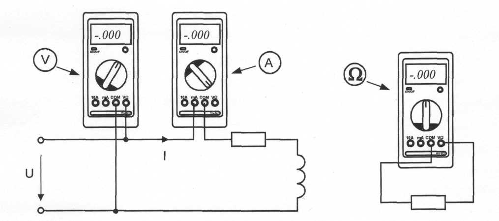 Для обеспечения надёжной длительной работы мультиметров соблюдайте следующие правила: · Не превышайте допустимых перегрузочных значений, указанных в заводской инструкции для каждого рода работы · Когда порядок измеряемой величины не известен, устанавливайте переключатель пределов измерения на наибольшую величину. · Перед тем, как повернуть переключатель для смены рода работы (не для изменения предела измерения!), отключайте щупы от проверяемой цепи. · Не измеряйте сопротивление в цепи, к которой подведено напряжение. · Не измеряйте ёмкость конденсаторов, не убедившись, что они разряжены. Будьте внимательны при измерении тока мультиметрами MY62 и MY64. Предохранитель 0,2 А этих мультиметров может перегореть от источников напряжения, имеющихся в данном стенде. Мультиметр MY60 защищен предохранителем 2 А, который не может перегореть от токов, создаваемых источниками данного стенда. До подключения мультиметра к цепи необходимо выполнить следующие операции: 1) выбор измеряемой величины: -V, ~V, -А, ~А или W; 2) выбор диапазона измерений соответственно ожидаемому результату измерений; 3) правильное подсоединение зажимов мультиметра к исследуемой цепи. Присоединение мультиметра как вольтметра, амперметра и омметра показано на рис. 5