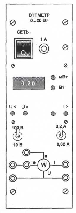 Общий вид ваттметра приведен на рис. 6. Его принцип действия основан на перемножении мгновенных значений тока и напряжения и отображении среднего значения этого произведения на дисплее прибора в цифровом виде. Прибор включается в цепь согласно приведённой на лицевой панели схеме. Для измерения активной мощности гнёзда, помеченные символом «•», должны быть соединены перемычкой. После сборки схемы необходимо включить выключатель «Сеть» и установить необходимые пределы измерения по току и по напряжению тумблерами. Если выбран заниженный предел измерения, то включается сигнализация перегрузки «I>» или (и) «U>». Если, наоборот, предел завышен, то включается сигнализация «I<» или (и) «U<». Справа от окошка цифровых индикаторов с помощью светодиодов автоматически указывается размерность: Вт или мВт.