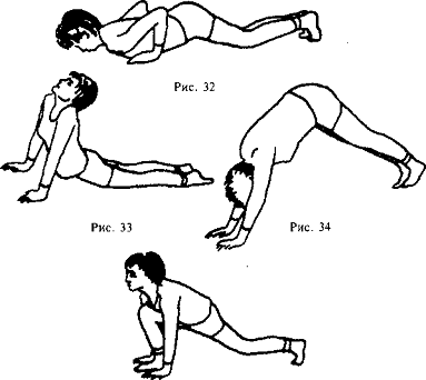 Рис. 27 Рис. 28 Рис. 29 ♦ Зафиксировав кисти рук и правую ногу, выдохнуть, отводя левую ногу назад и касаясь земли коленом. Смотреть вперед (рис. 30). ♦ Задержав дыхание, отвести правую ногу назад, выпрямив тело в струнку. Смотреть вперед (рис. 31), ♦ Выдыхая, согнуть локти, повернуть большие пальцы ног, положить на землю лоб, грудь и колени. Поднять зад вверх, расслабив спину (рис. 32). ♦ Вытянуть пальцы ног вдоль земли, выпрямить руки, максимально возможно прижимать бедра к земле и прогибаться в спине. Голова отведена назад, растягивая шею. В процессе выполнения упражнения осуществляется вдох (рис. 33). Подвернуть вперед пальцы ног и, выдыхая, выпрямить ноги, чтобы спина оказалась максимально высоко поднятой вверх, а вы при этом опирались бы на ступни и ладони. Голова свободно свисает, пятки прижаты к полу (рис. 34). Выполнять упражнение, выпрямив тело и поставив правую ногу между кистями рук. Смотреть вперед (рис. 35). Выдыхая, подтянуть левую ногу и выпрямить обе ноги, не отрывая ладони от земли (рис. 36). ♦ Выпрямиться, вдохнуть и завести выпрямленные руки за голову, прогибаясь назад (рис. 37). ♦ Сложить руки на груди в позе молящегося. При этом выпрямляться и совершать вдох (рис. 38). При выполнении соответствующих упражнений кисти рук не должны отрываться от земли в процессе выполнения всей последовательности движений. Если вы не в состоянии прижимать ладони к земле, не сгибая ног, обеспечьте полный контакт между полом и кончиками пальцев.