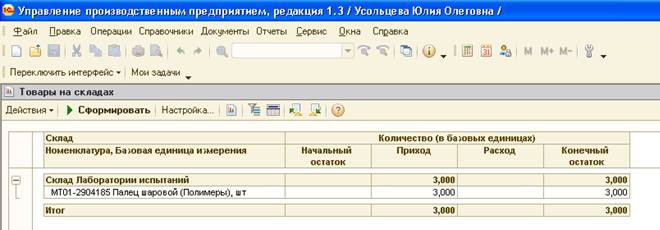 После этого требуемое количество появляется на складе. Экономист ПЭО может проверить это путем формирования отчета: Отчеты – Запасы – «Товары на складах» с указанием нужного склада.