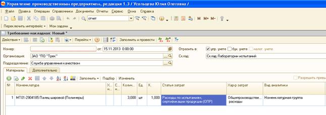 Со «Склада Лаборатории испытаний» требованием-накладной сотрудник лаборатории самостоятельно списывает продукцию в момент проведения испытания. Руководитель испытательной лаборатории является материально-ответственным лицом по своему складу, поэтому должен мониторить свой склад в 1С УПП, чтобы избежать скопления продукции на складе. Документы – Управление запасами – Требование-накладная. На рисунке ниже изображен пример заполнения данного документа. В поле Склад – «Склад лаборатории испытаний», Подразделение «Служба управления качеством», Статья затрат – «Расходы по испытаниям, сертификации продукции (ОПР)». На вкладке дополнительно указывается проект «Отечественные», «Аутсорсинговые продукты», «Иномарочные» и т.д., в зависимости от испытываемой номенклатуры.