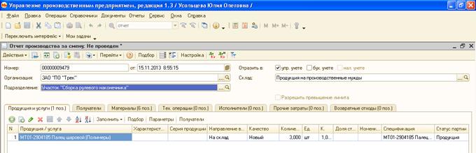 2.1 Начальник участка по запросу специалиста службы-инициатора проведения испытаний делает выпуск продукции. Документом «Отчет производства за смену» приходует требуемое количество продукции на «Склад Лаборатории испытаний»:
