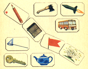 Ход игры на занятии На столах у детей лежат карточки (одна на двоих). У воспитателя - карточка с изображением карандаша. Воспитатель объясняет: «Сегодня мы будем выкладывать цепочку из предметов. Наша цепочка начнется со слова карандаш. Следующим звеном цепочки будет слово, которое начинается с того звука, каким кончается слово карандаш. Кто из вас найдет предмет с таким названием у себя на картинке, подойдет к доске, присоединит свою картинку к моей и назовет свой предмет так, чтобы четко слышался последний звук в слове. Если вы, дети, найдете сразу два предмета, то приложит картинку тот, кто нашел ее первым. А оставшуюся картинку присоедините позже, когда снова потребуется для цепочки слово с таким звуком». Когда будет выложена вся цепочка (ее можно разместить на фланелеграфе по кругу), воспитатель предлагает детям хором называть предметы, начиная с любого указанного, слегка выделяя голосом первый и последний звуки в каждом слове. Ход игры вне занятия Играют 4-6 детей» Карточки (изображением вниз) лежат посередине стола. Каждый берет себе одинаковое количество карточек (4 или 2). Начинает выкладывать цепочку тот, у кого звездочка на карточке. Следующую картинку прикладывает ребенок, у которого название изображенного предмета начинается с того звука, каким кончается слово - название первого предмета. Выигравшим считается тот, кто первым выложит все свои карточки. Date: 2015-07-27; view: 542; Нарушение авторских прав |